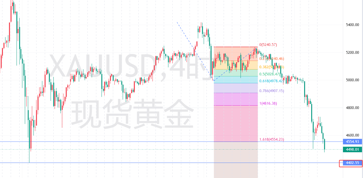 本周收盘已明确确认,黄金空头趋势完全确立 ,且动能强劲,短期内无任何反转迹象 。本周是黄金彻底转向空头的关键一周,6年来最大单周跌幅 ,连续跌破六大整数关口,多重利空共振导致金价承压下行,空头趋势全面确立。后续行情 ,空头仍将主导全局 ,短期反弹仅为技术性修复,无法改变整体下行格局。短期来看,金价将继续围绕4500关口震荡整理 ,重点关注4450-4500美元区间的支撑力度,若有效跌破4450美元,将进一步下探4300-4200美元区间;中长期来看 ,美联储鹰派政策 、高通胀预期、强势美元的格局短期内难以改变,黄金下行趋势明确,仍有进一步下行空间 ,切勿抱有侥幸心理认为行情已见底 。