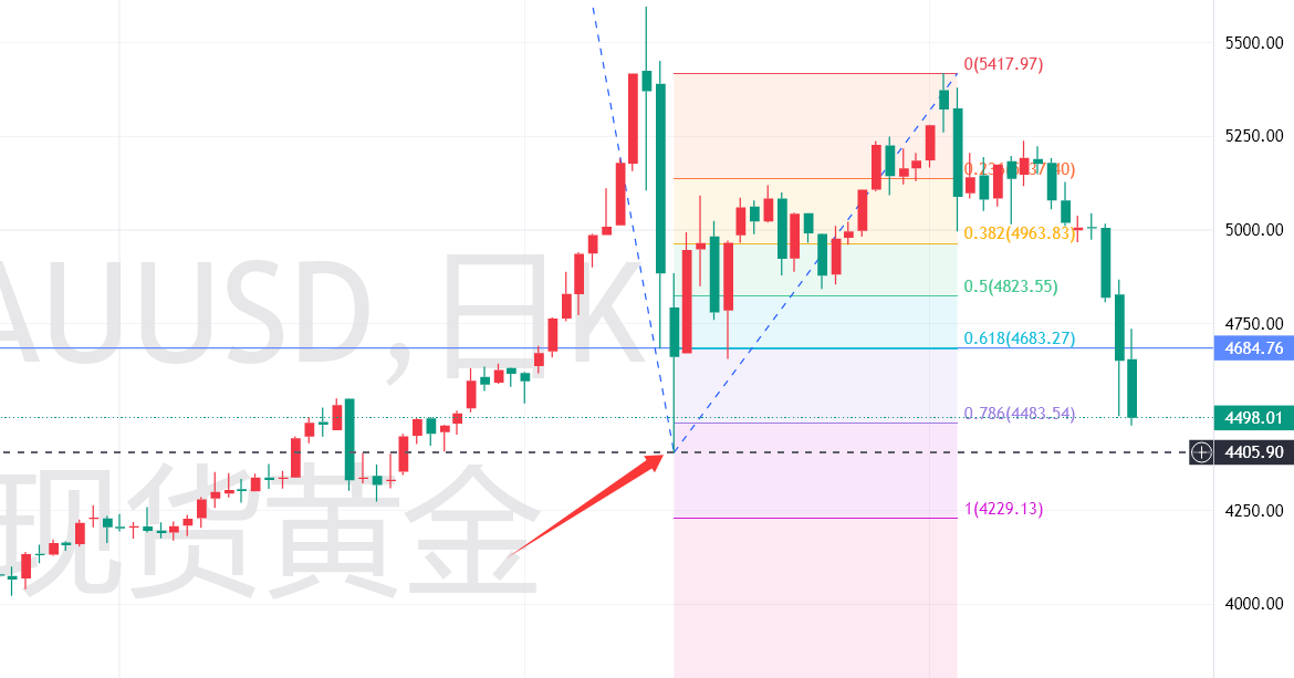 本周国际金价经历了一轮剧烈而凌厉的调整。现货黄金周初报5023.53美元/盎司 ,周三早晨被突然打破 。现货黄金跌破4970美元关键支撑位后迅速加速下行 ,两个多小时内暴跌约120美元,最低下探至4860美元附近才暂时企稳 。进入周四亚洲时段,黄金再度出现恐慌性抛售 ,录得自2月初大跌以来最陡峭的一轮下行,自4833美元一路下探至4538美元,逼近北美股市开盘前创下阶段新低。尽管金价随后在4538美元附近出现技术性反弹 ,并一度迅速拉升至4630美元上方,但整体修复力度仍然有限。在4538美元至4575美元区域初步形成短线支撑后,黄金于周四迎来全周唯一较为明确的一段反弹行情 ,最高回升至4733美元附近 。然而,当金价第二次冲击4730美元区域失败后,空头再度占据主动。周五盘中 ,现货黄金自4722美元再度大幅下挫,一路跌破4500美元关口,最低触及4477.54美元 ,最终周线收于4500美元下方附近 ,走势明显偏弱。